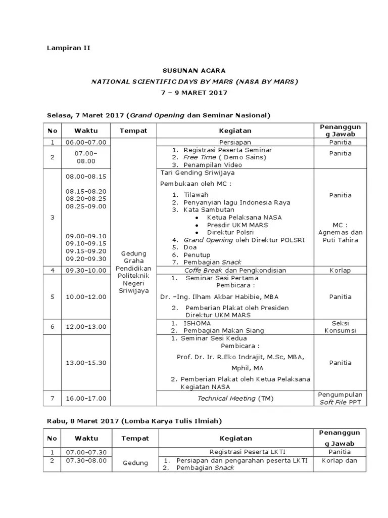 Susunan cara, susunan panitia, anggaran dana, dan lampiran. Yang menjadi poin penting dalam membuat proposal kegiatan acara yaitu dengan. Secara umum, hal yang ditulis dalam proposal suatu kegiatan adalah latar belakang, tujuan, kegiatan, waktu dan tempat, pelaksana, dan rencana . Lampiran ini bisa berisi tentang susunan panitia kegiatan, gambar pendukung,. 6) susunan panitia/tim pelaksanaan (biasanya ditulis dalam lampiran).